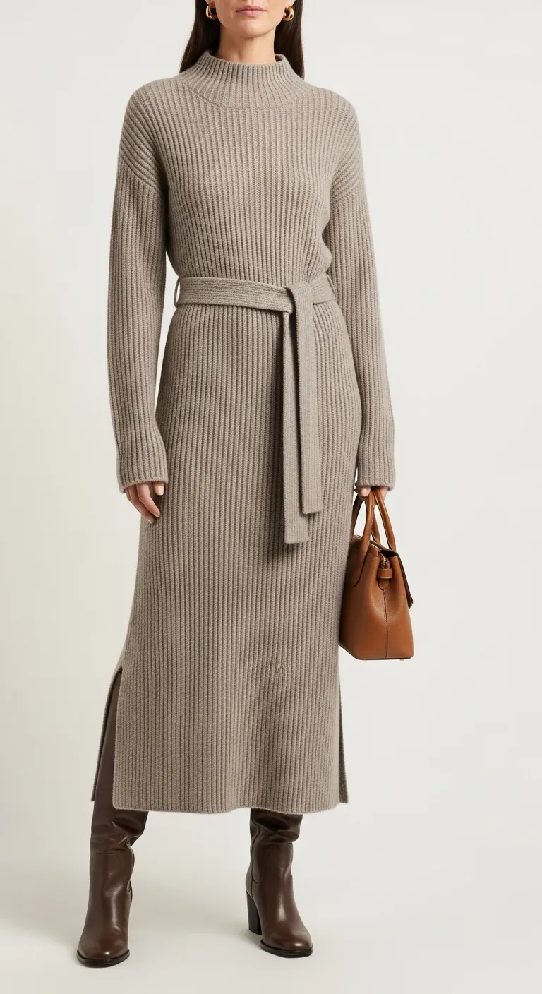 A matching tie-waist belt allows you to cinch the waist for a defined shape or wear it loose for a more relaxed fit. The mock turtleneck and long sleeves provide a cozy, refined feel. This is a one-and-done outfit that looks incredibly put-together.