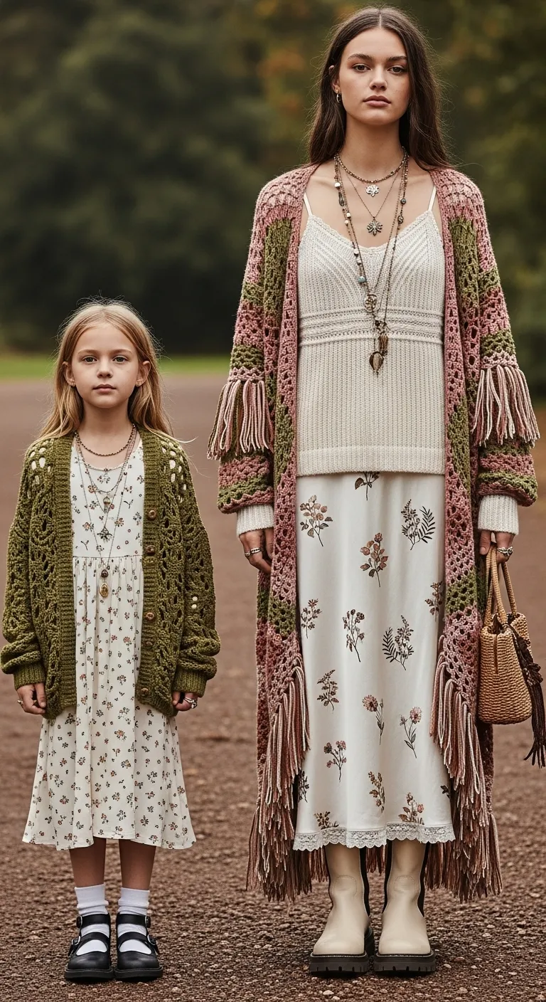 Introduce a long, open-knit cardigan with fringe detailing, a key piece that adds both texture and a bohemian flair to your ensemble. Alternatively, a shorter version of the cardigan can be worn over a simple dress with a small floral pattern. These pieces give your outfit a soft, whimsical feel.