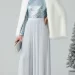 Elegance is found in the beautiful, fluid movement of fabric in this artistic ensemble. The look features a stunning grey dress with intricate draping and gathering across the bodice. The soft, jersey-like material falls into an asymmetrical, layered skirt.