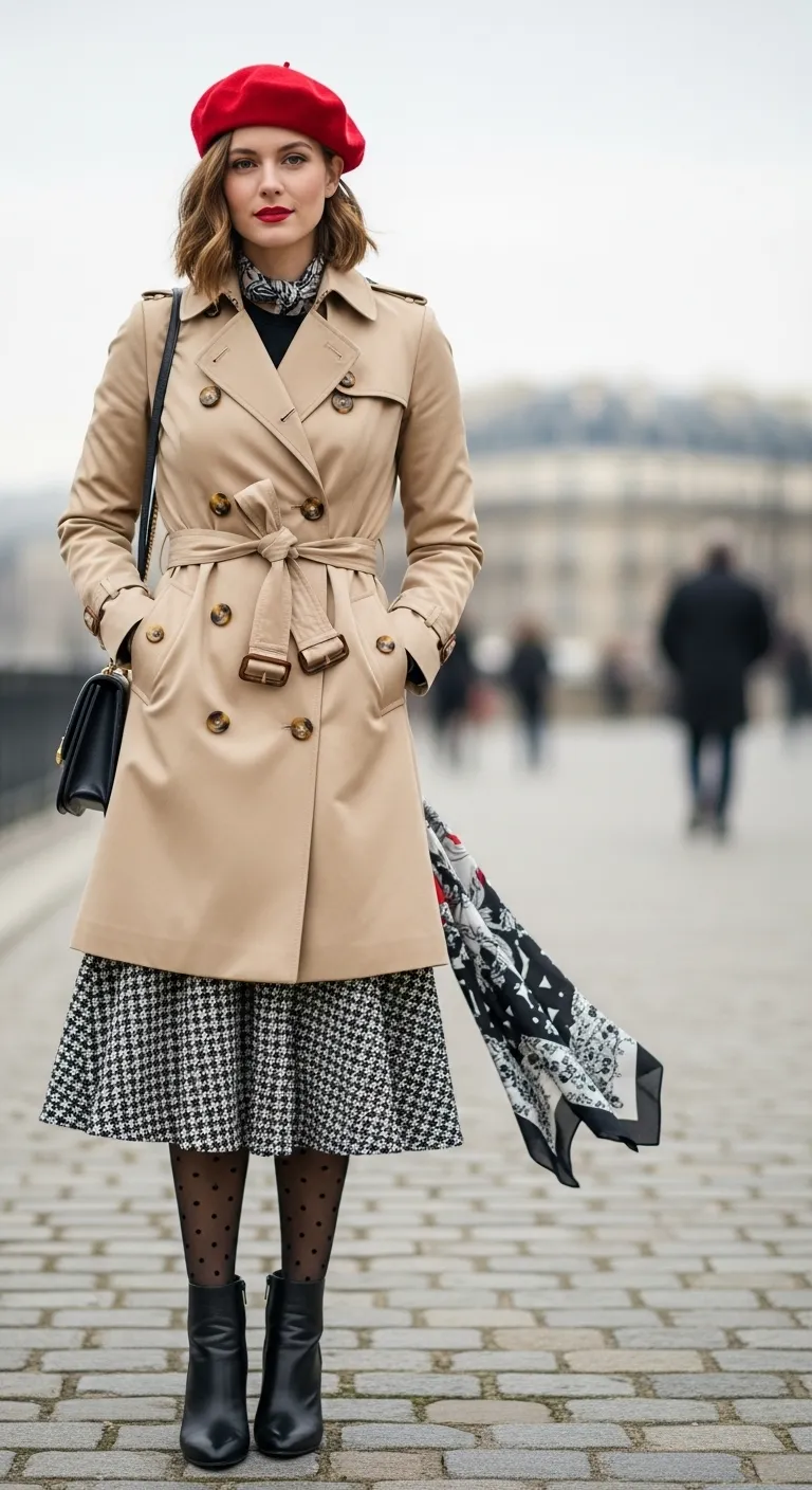 A quintessential beige trench coat, belted at the waist, adds a layer of polish and practicality. Underneath, a simple black top keeps the look grounded. The finishing touch is a bright red beret, which provides a confident pop of color.