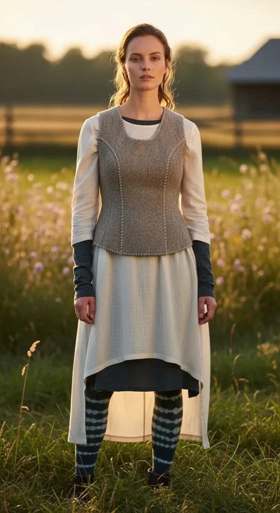 A structured, tweed-like vest worn over the top adds shape and a rustic texture. This piece cinches the waist and introduces a different material to the mix, adding visual interest. The combination has a timeless, almost historical feel.