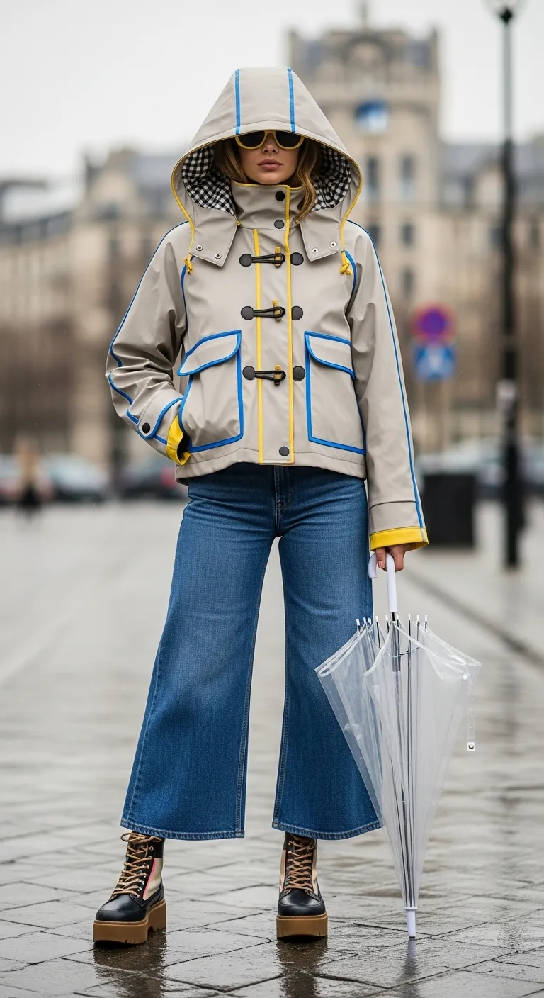 A generously sized hood, lined with a classic gingham print, offers protection from the rain. Pair this fun jacket with wide-leg cropped jeans and a pair of sturdy, platform boots. It’s a functional and fashion-forward look that proves rainy-day outfits can be exciting.