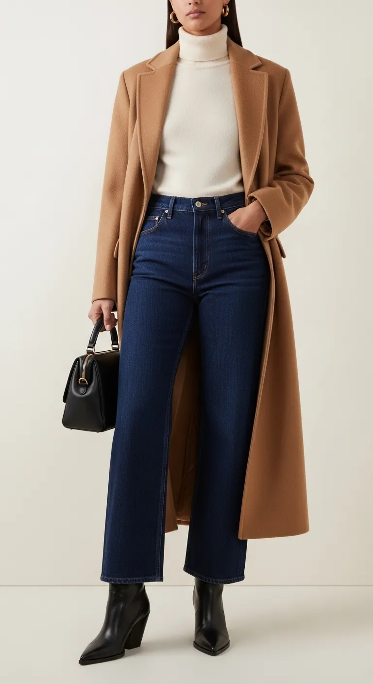 This ensemble is the epitome of classic, effortless elegance. It pairs deep indigo wide-leg jeans with a simple cream turtleneck sweater. This clean and simple base provides the canvas for a truly timeless outerwear piece.