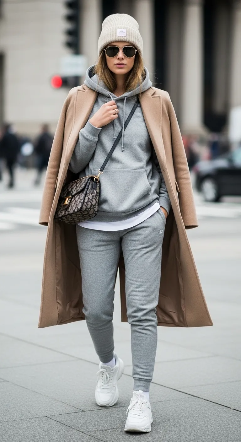 Combine the comfort of a sweatsuit with the structure of a tailored coat for a modern, high-low look. The long, clean lines of a classic camel coat provide a sophisticated frame for the casual pieces underneath. This contrast is intentional and stylish.