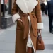 It has all the classic shirt details: a collar, chest pockets, and a button-down front. A matching belt defines the waist. Worn with a black turtleneck underneath, it’s a warm and powerful look.