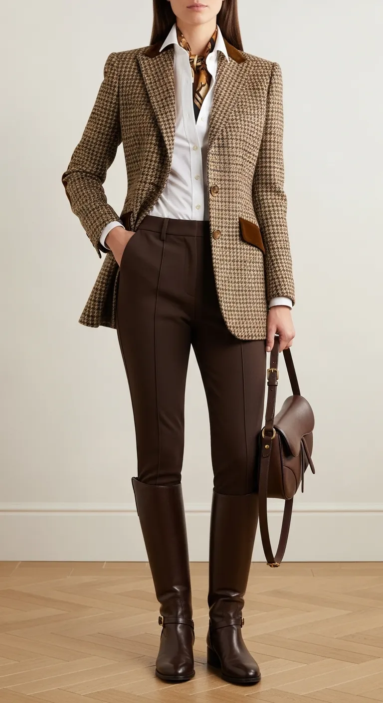Capture a timeless and sophisticated look with an outfit inspired by classic equestrian style. The foundation of this ensemble is a beautifully tailored houndstooth tweed blazer, complete with refined details like a velvet collar and elbow patches.